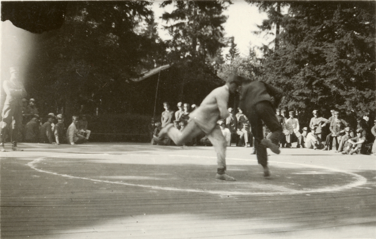 Text i fotoalbum: "Efter asp.skolans slut placerades vi på trupp på Ing 1 juni - sept 1926. I juni foro vi till Laxön. Söndag i lägret".