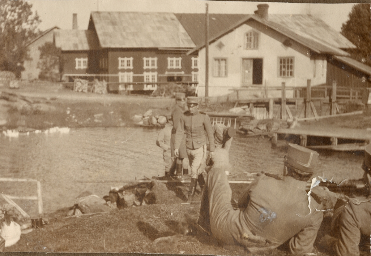 Titel: Soldater vid vattendrag.