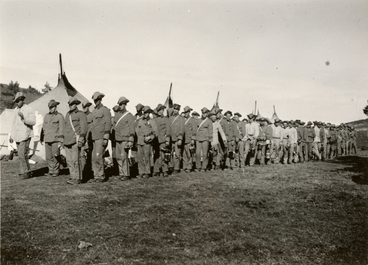 Text i fotoalbum: "Brobyggnad i Storvreta under mötet 1931. Våra kockar lagade bra mat".