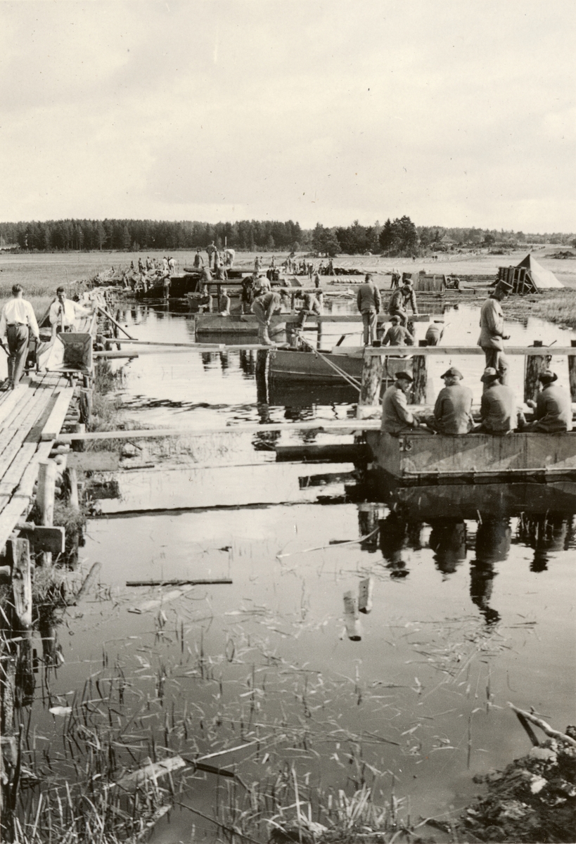 Text i fotoalbum: "Brobyggnad i Storvreta under mötet 1931. Snart började påloken bliva färdiga och då langade vi ut de tunga järnbalkarna, de största vägande 3 ton ".