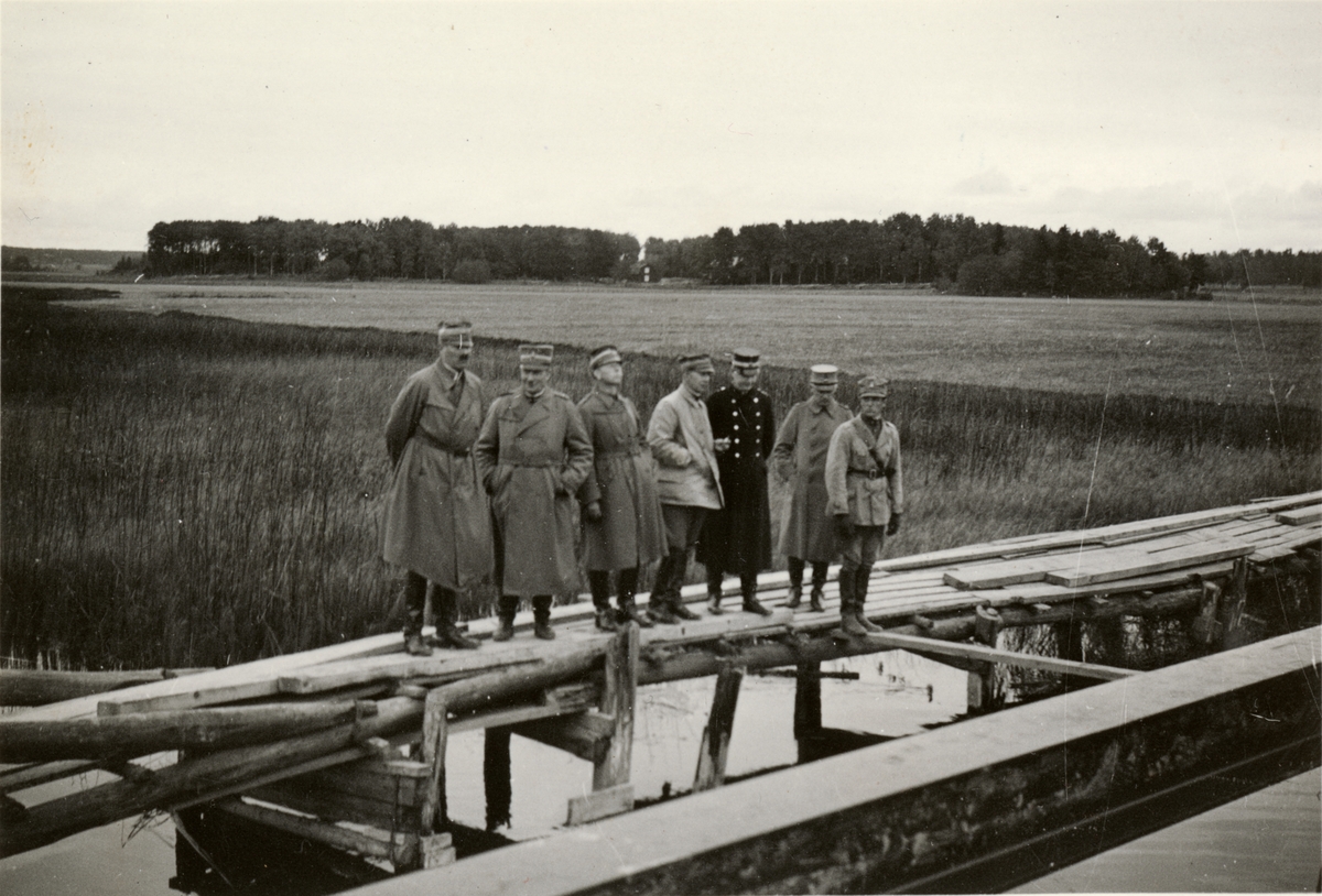 Text i fotoalbum: "Brobyggnad i Storvreta under mötet 1931. Brobygget inspekterades av kårchef".