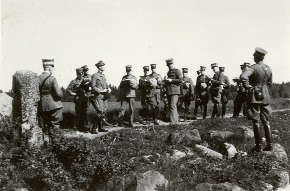 Text i fotoalbum: "Utövning i krigskonst maj 1937, kombinerad med blomplockning".