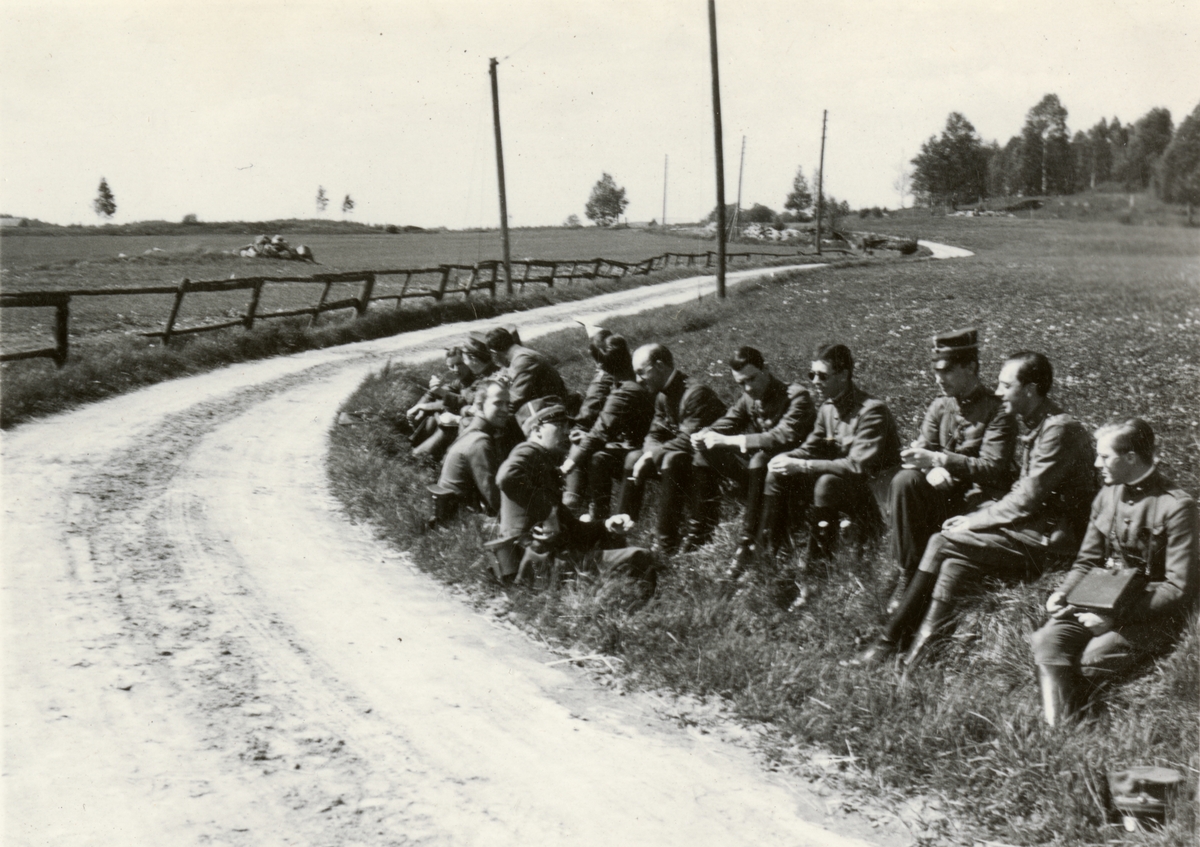 Text i fotoalbum: "Utövning i krigskonst maj 1937, kombinerad med blomplockning".