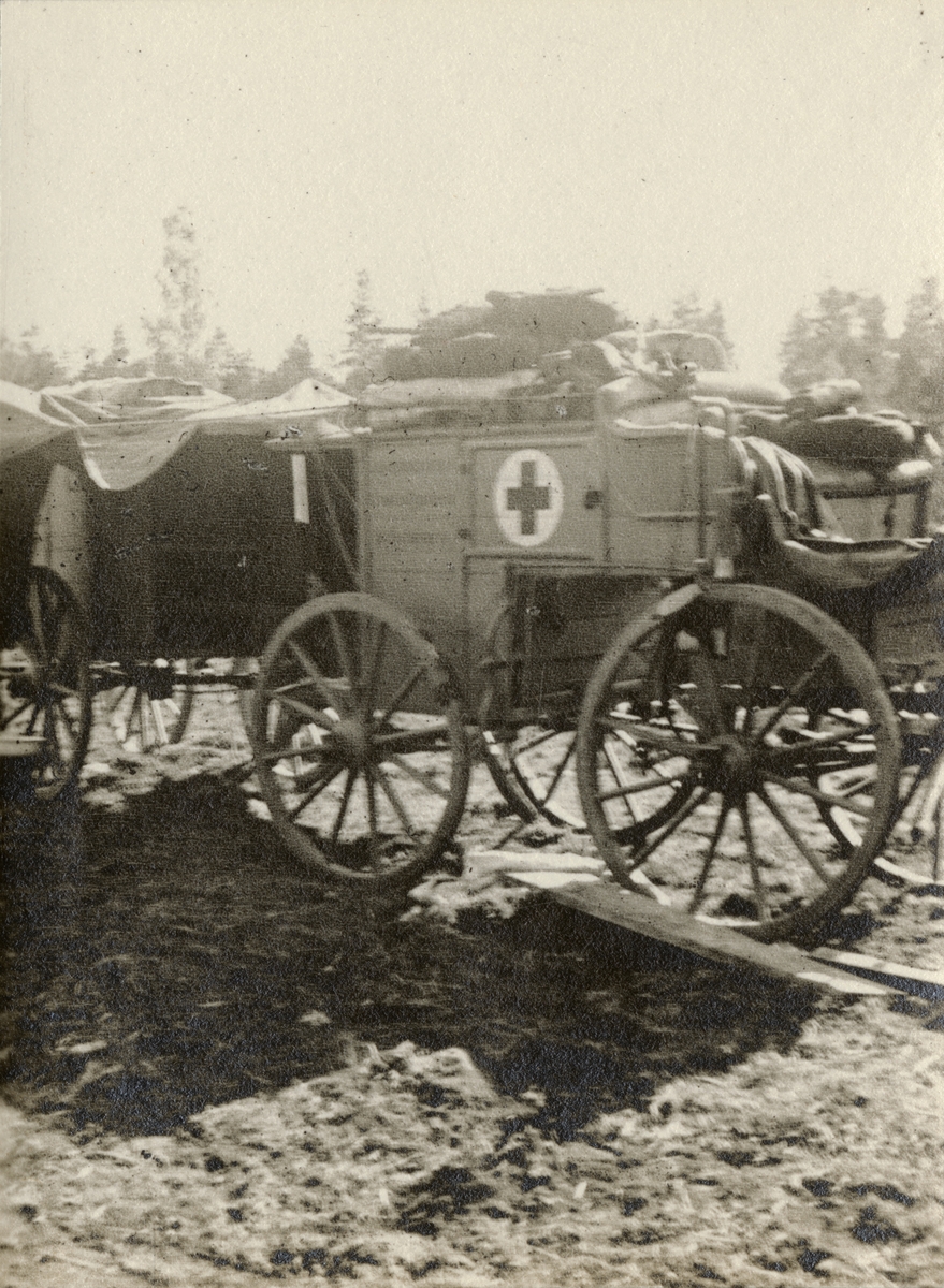 Titel: Sjukvårdsvagnar på övningsplats.