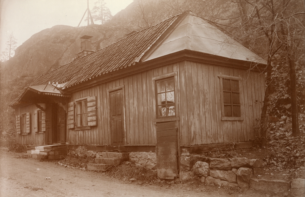 Titel: Text i fotoalbum: "Gammal byggnad från 1600-talet (förr landsvägskrog) från norra sidan".