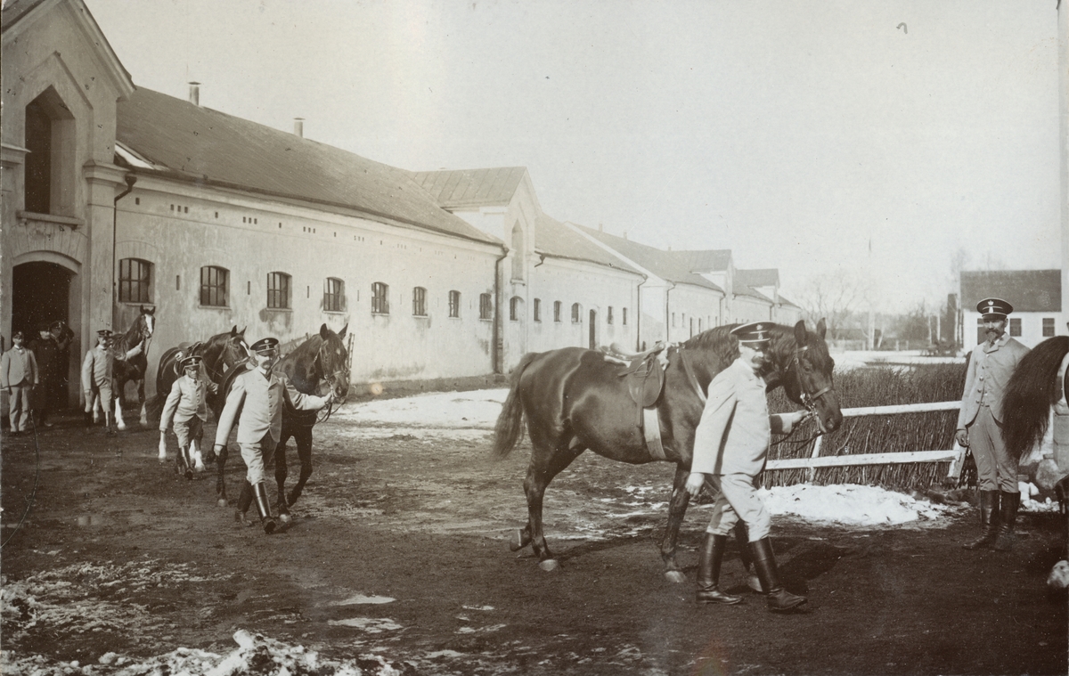 Titel: Text i fotoalbum: "Hingstar på väg till ridhuset".