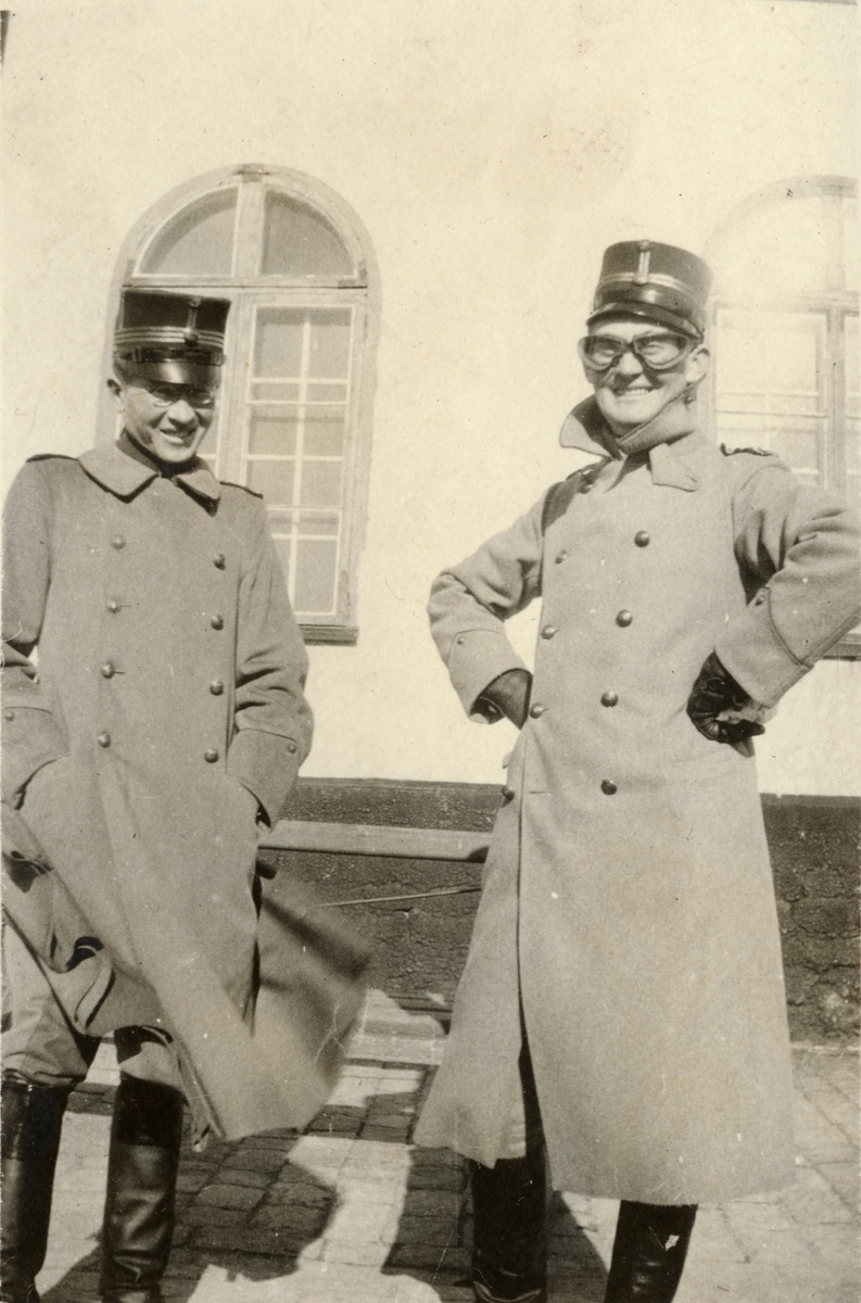 Titel: Text i fotoalbum: "Förbindelsekursen 1920". Soldater framför en byggnad.