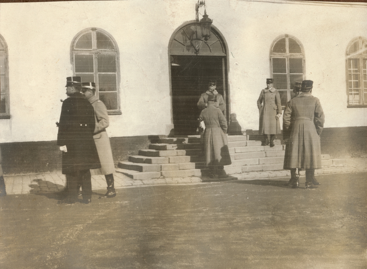 Titel: Text i fotoalbum: "Förbindelsekursen 1920". Soldater framför en byggnad.