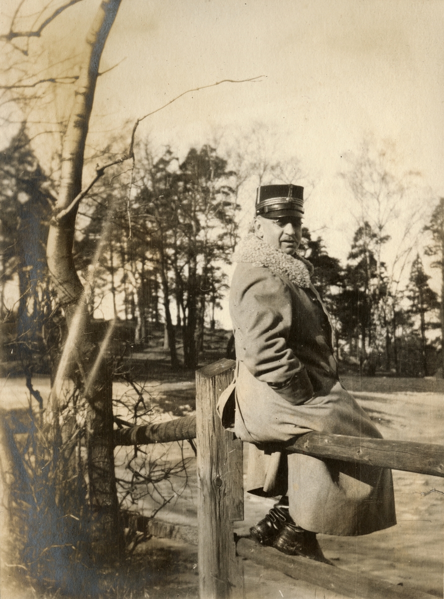 Titel: Text i fotoalbum: "Förbindelsekursen 1920". Soldater sittandes på staket.