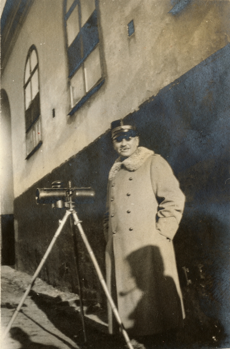 Titel: Text i fotoalbum: "Förbindelsekursen 1920". Soldat med signalutrustning på kaserngården.
