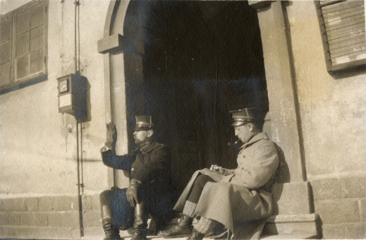 Titel: Text i fotoalbum: "Förbindelsekursen 1920". Soldater sittandes på trappan.