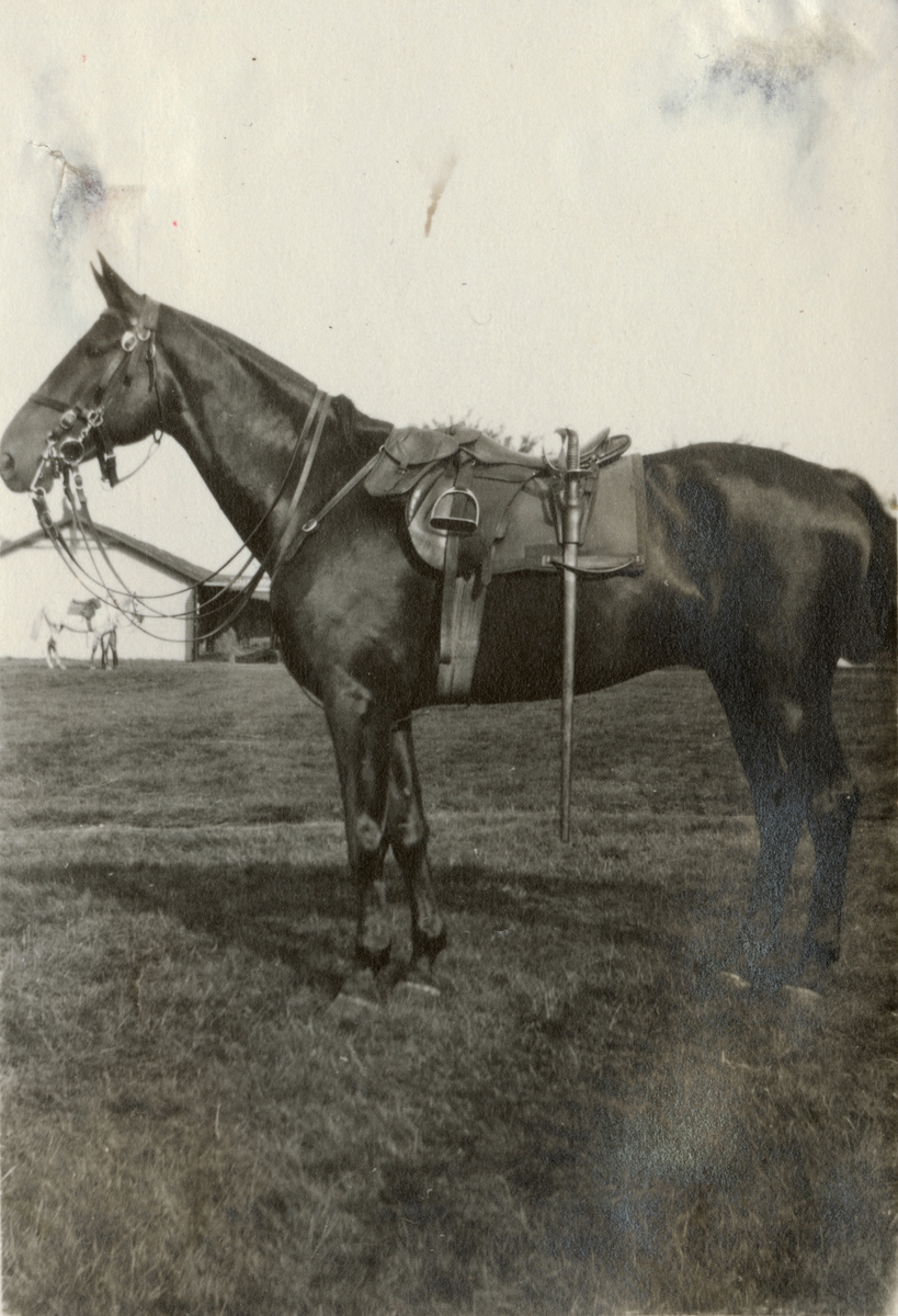 Titel: Text i fotoalbum: "Förbindelsekursen 1920". Häst i närbild.