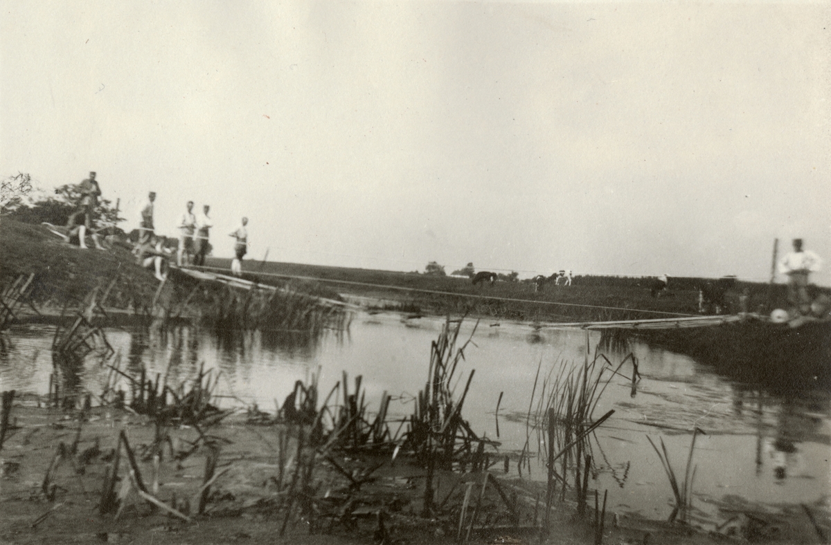 Titel: Text i fotoalbum: "Förbindelsekursen 1920". Hängbro över vattendrag.