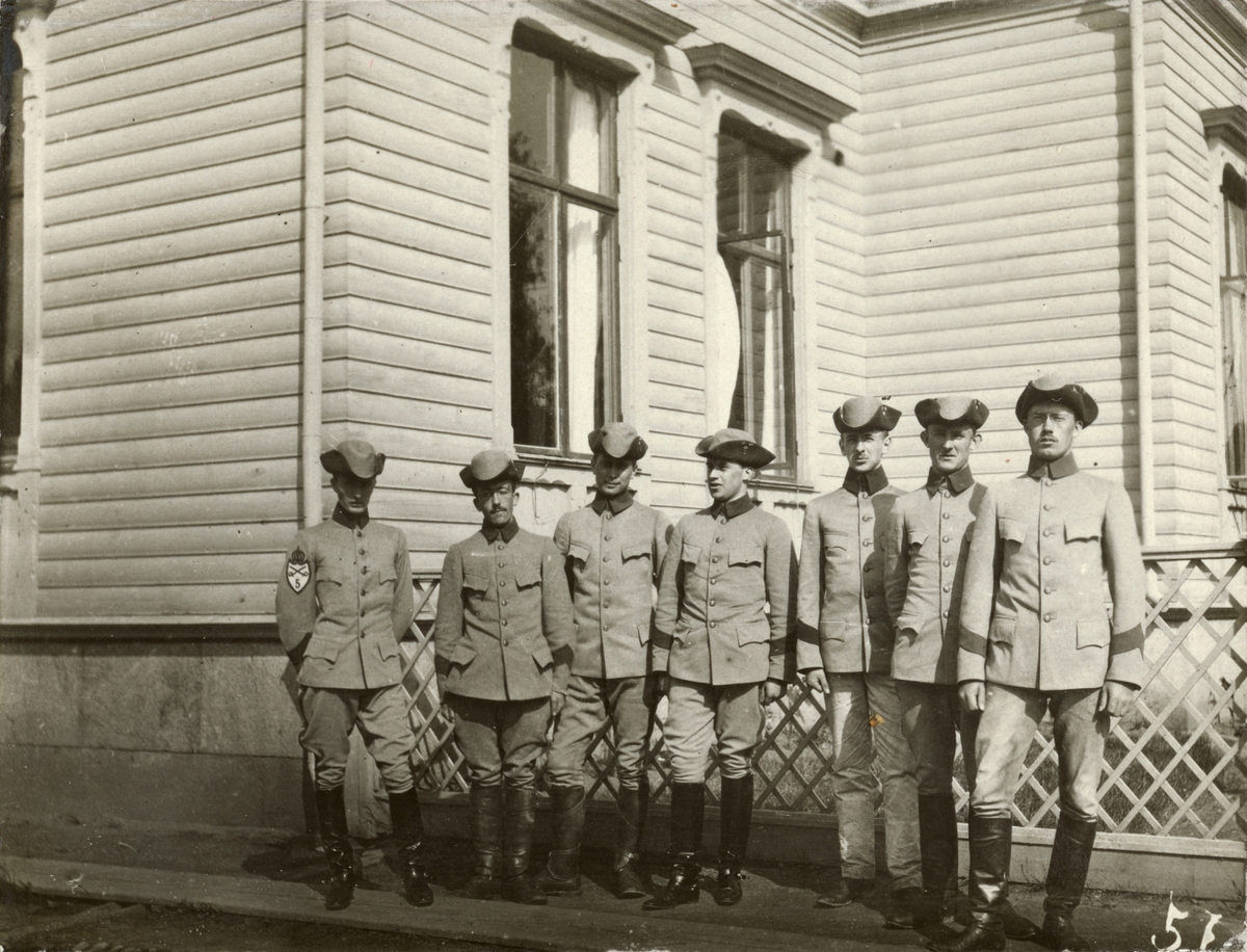 Titel: Gruppbild framför en byggnad med soldater från Kavalleriskolan i Umeå.