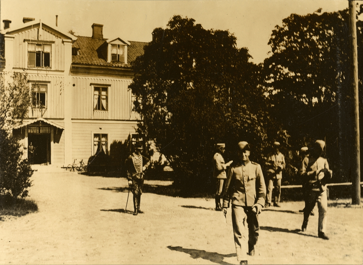 Titel: Soldater från Kavalleriskolan på kasernområde.
