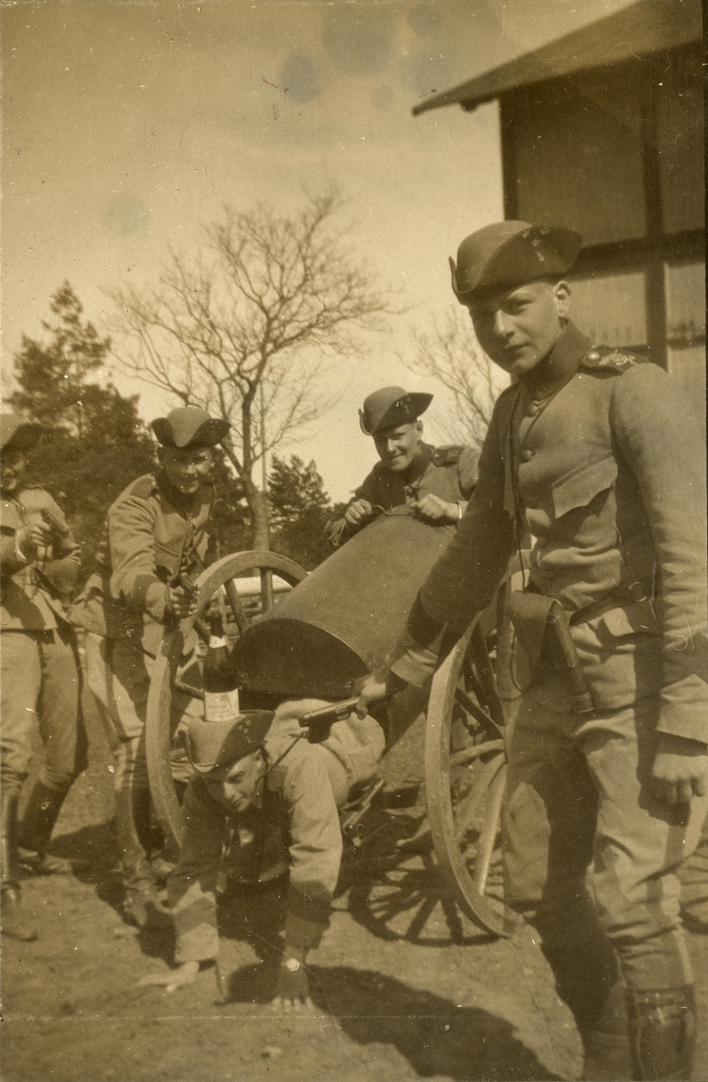 Titel: Soldater från Kavalleriskolan framför en byggnad.