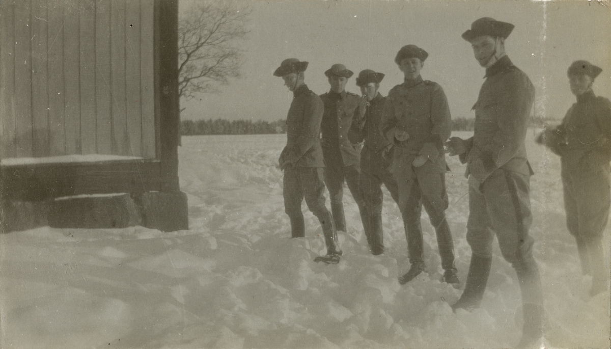 Titel: Soldater lättar sig vid en byggnad.