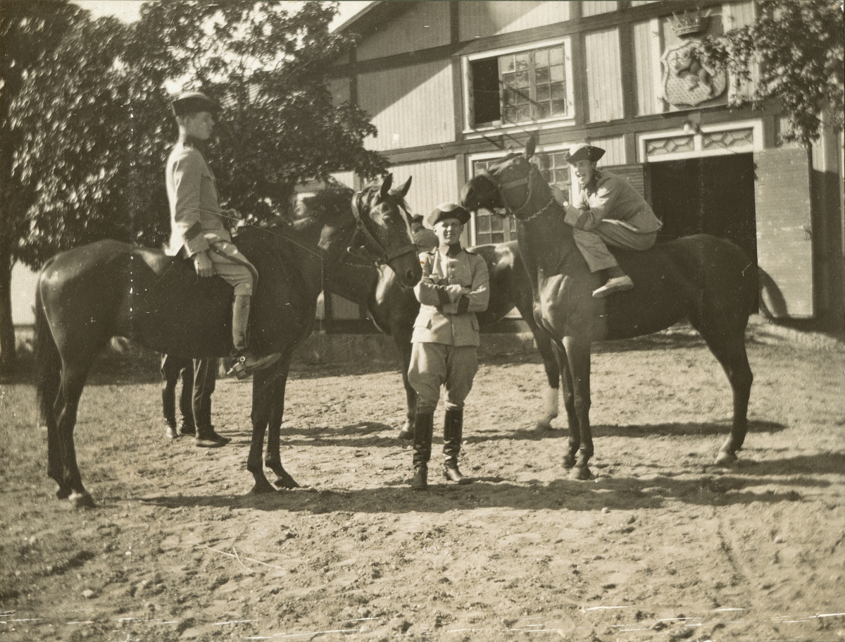 Titel: Soldater till häst framför en byggnad.