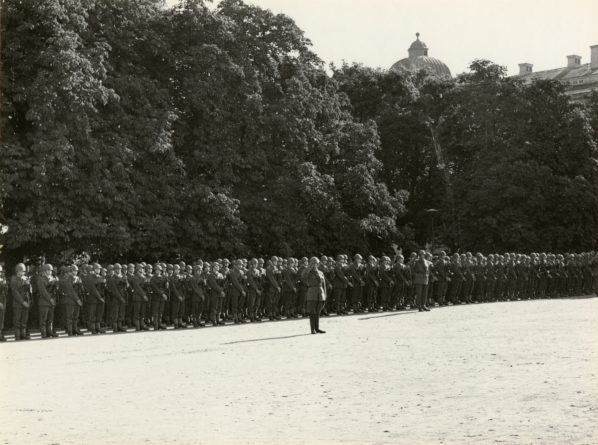 Titel: Text i fotoalbum: "Fanöverlämning 27 september 1955. II bat skyldrar. Bataljonschef: major J. Lindgren".