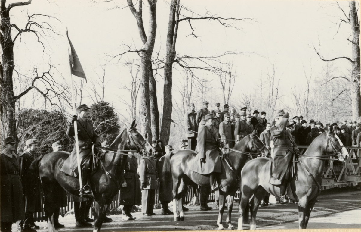 Text i fotoalbum: "Avskedesparaden 10 mars 1957. Militärbefälhavaren, generalmajor G. Dyrssen åtföljd av stabschef major Wahlgren och förare av kommandotecken den 10/3 1957".