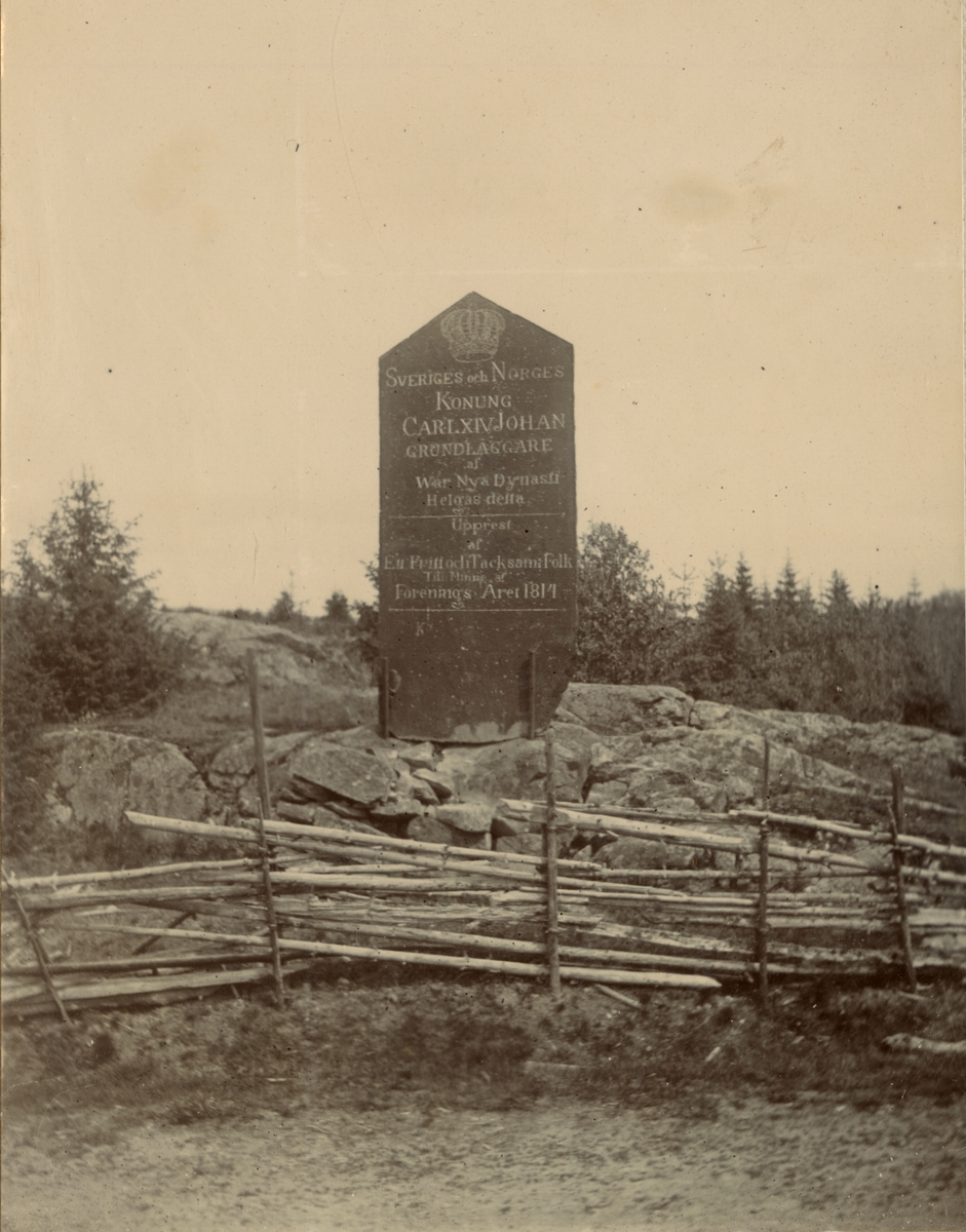 Minnesten med text: "Sveriges och Norges Konung Carl XIV Johan. Grundläggare af Wår Nya Dynasti. Helgas detta. Upprest af En Fritt och Tacksam Folk. Till Minne af Förenings Året 1814".