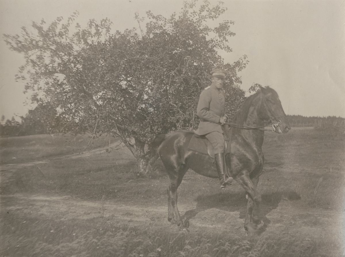 Text i fotoalbum: "Löjtnanten 4/7-1916. Gick först som menige man och sedan som troppförare vid 1sta kompaniet, och förde sedan som kompanichef efterhand alla fyra kompanier inom regementets första bataljon."