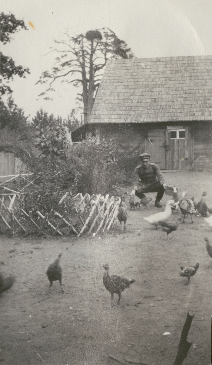 Titel: Text i fotoalbum: "Bataljonsadjutanten, Lt. Textor matar hönsen."