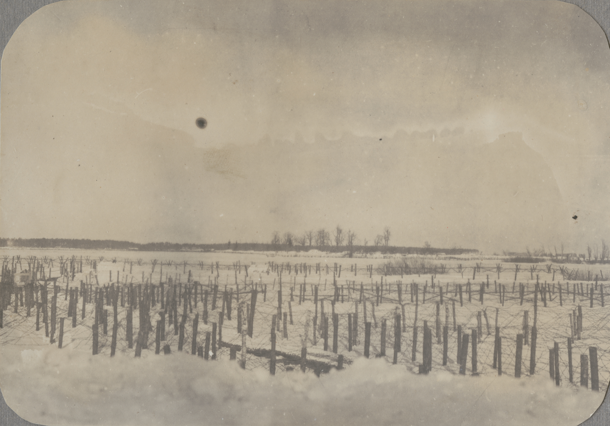 Text i fotoalbum: "Januari 1917. (då vi hade att uthärda svåra ryska anfall, Winterschlacht am der Aa). Olai ställningen. Taggtrådstängsel med genomgång till lysnarposten. I bakgrunden ryska ställningaen vid Olai "