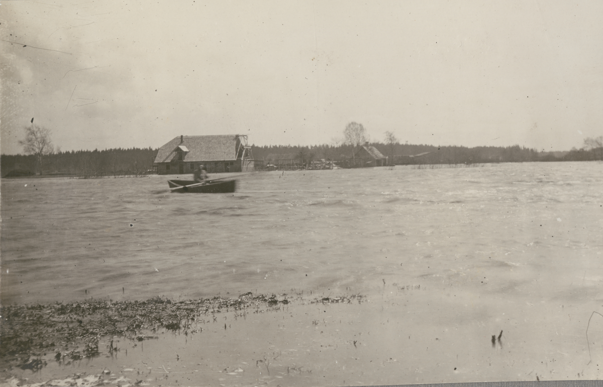 Text i fotoalbum: "Våren 1917 vid Olai. Af vårt manskap byggt hus för Kansliet, hästar och bagage tillhörande 1 sta och 2dra komp (öfversvämmadt).