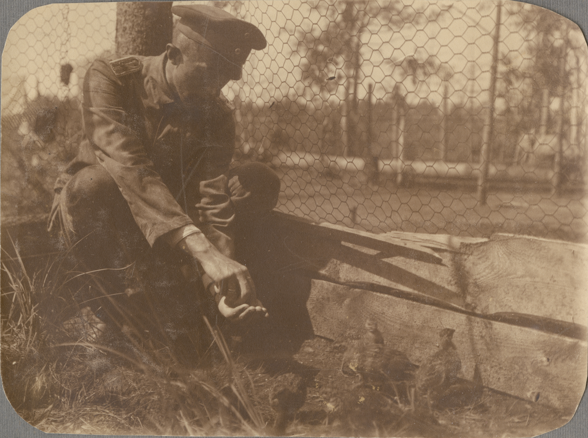 Text i fotoalbum: "Augusti 1917. Mina and- och orrkyklingar, infångades 2 dagar gamla, uppmanades på spiseln, matades med myrägg, blefvo så tama att de hoppade upp på min hand och arm. Utsattes flera gånger för attentat af ryska granater."