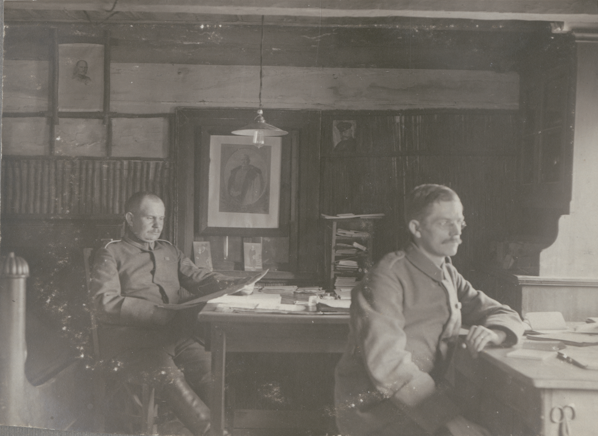 Text i fotoalbum: "Januari 1918. 4de komp. byrå i Holoby. Feldwebel Meyer, Schreiter Runge från Stockholm."