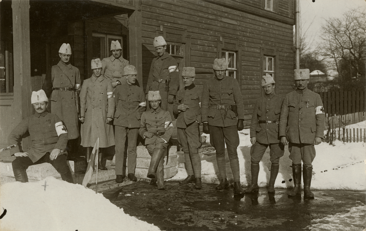 Text i fotoalbum: "Vid svenska kårens frontdetachement, Narwa 1919. Underofficerskåren, inkl. underbefäl och sjukvårdare."
