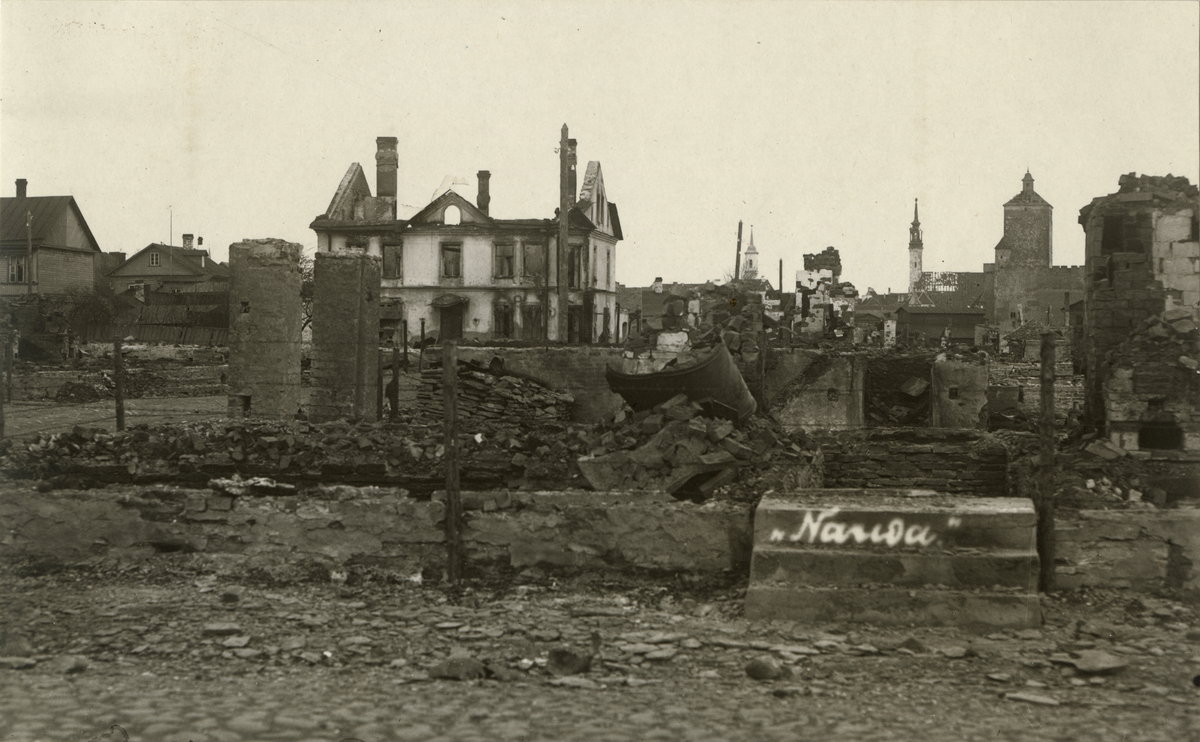 Titel: Text i fotoalbum: "En stadsdel efter bombardemanget."