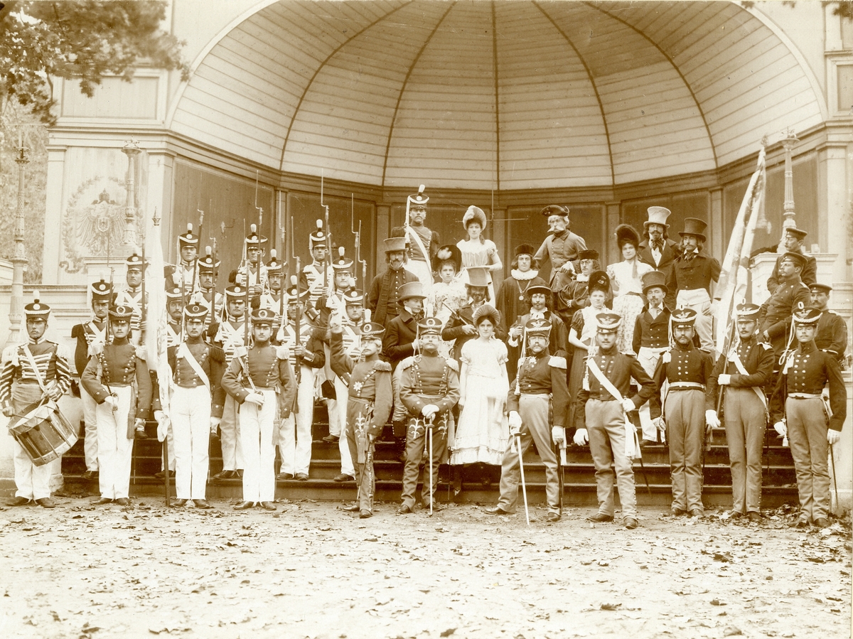 Tysk historisk tablå, grupp i uniformer uppställd vid musikpaviljong, 1800-talet.
