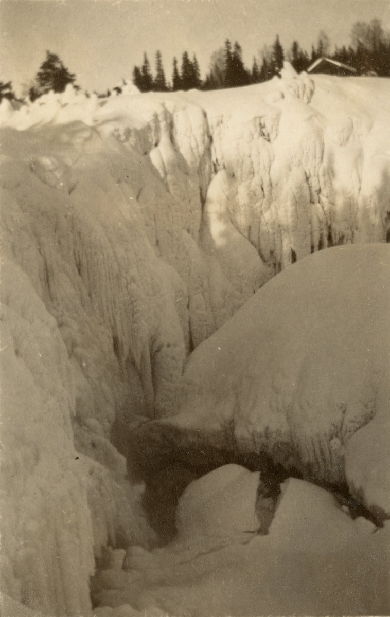 Text i fotoalbum: "Aspirantskolans vinterövningar i Björnänge febr.-mars 1926. En dag tolkade vi till Tännforsen och tillbaka. Tännforsen i vinterskrud".