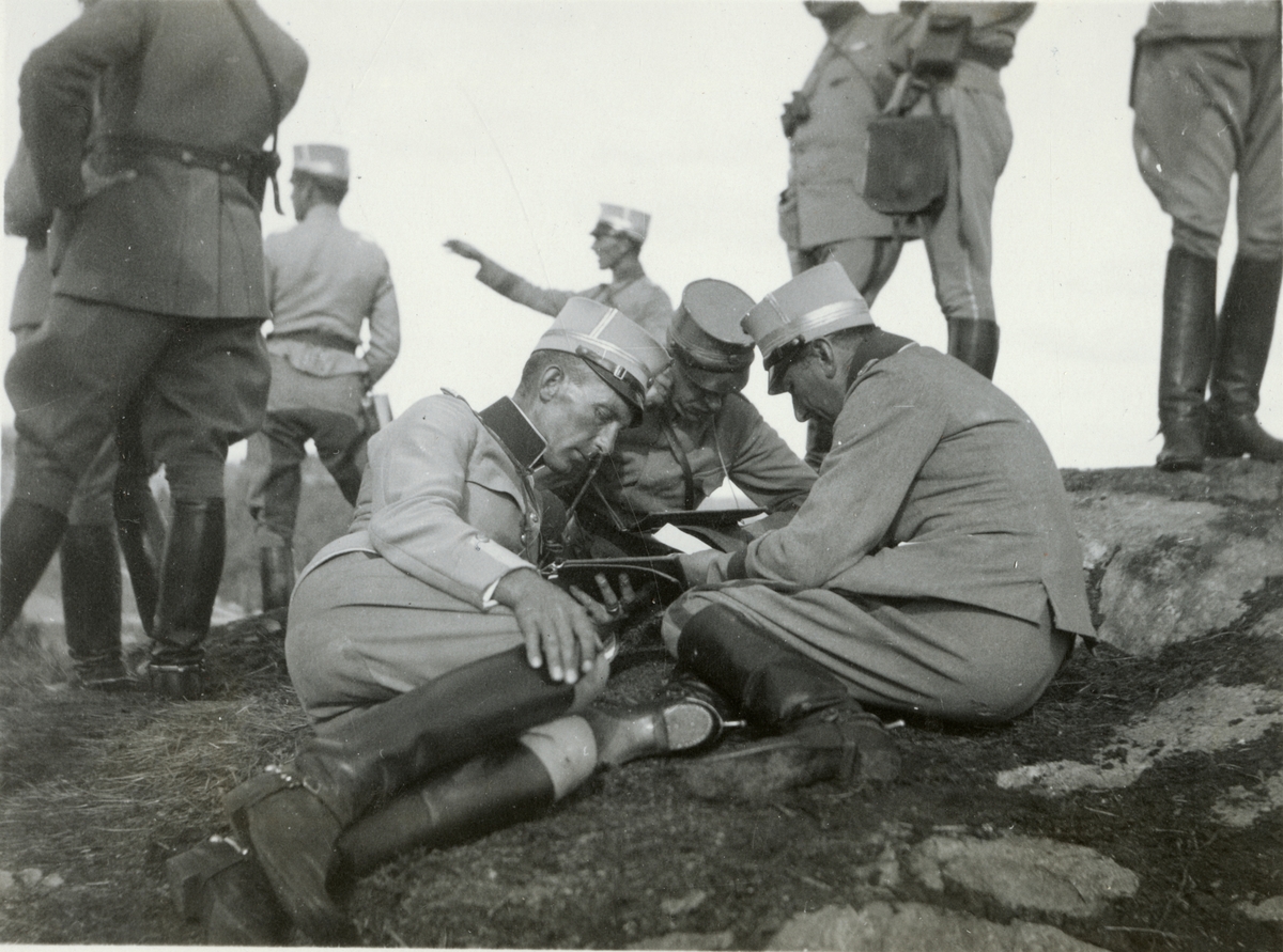 Titel: Text i fotoalbum: "Förbindelsekursen 1920". Soldater studerar kartor.