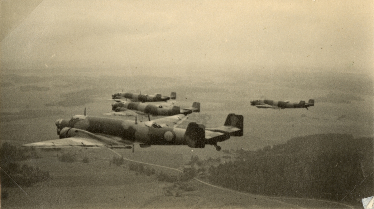 Text i fotoalbum: "Besök vid Västmanlands flygflottilj. Första tunga bombflottiljen är ute på rekogniseringstur."