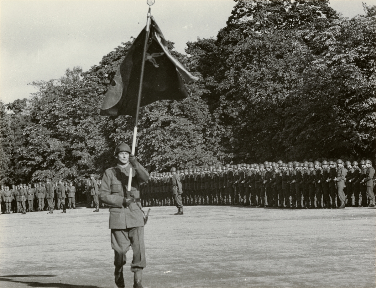 Titel: Text i fotoalbum: "Fanöverlämning 27 september 1955. Fanmarsch. Fanförare kapten H. Norgren".