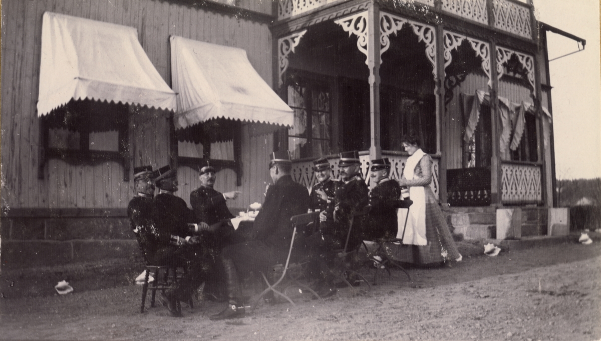 Titel: Kaffepaus vid en byggnad.