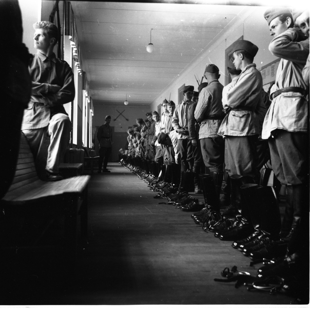 Uppställning vid logement. Norrlands dragonregemente K4, Umeå, 1955-1956.