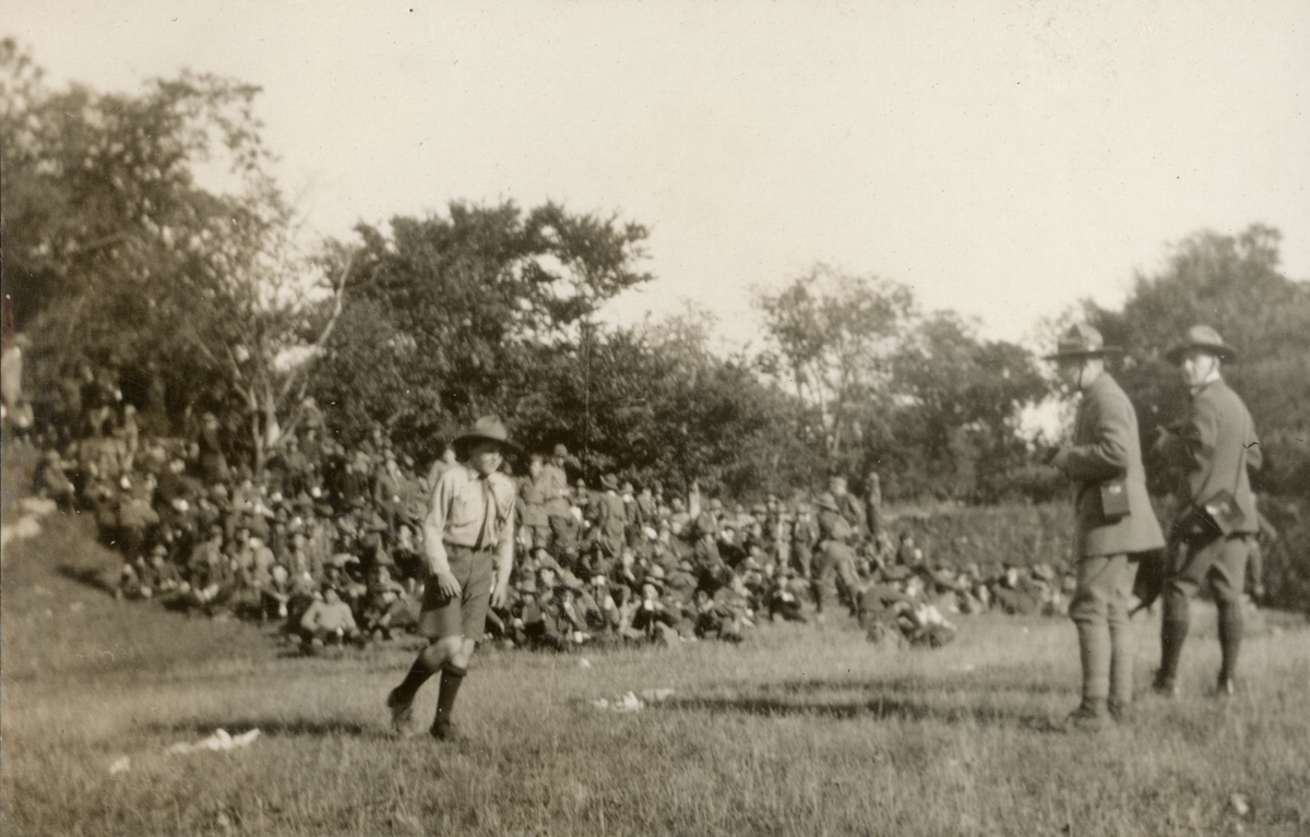 Titel: Bildtext: "Kåren deltog i Stockholms Scoutkårs manöver till Drottningholm 1919."