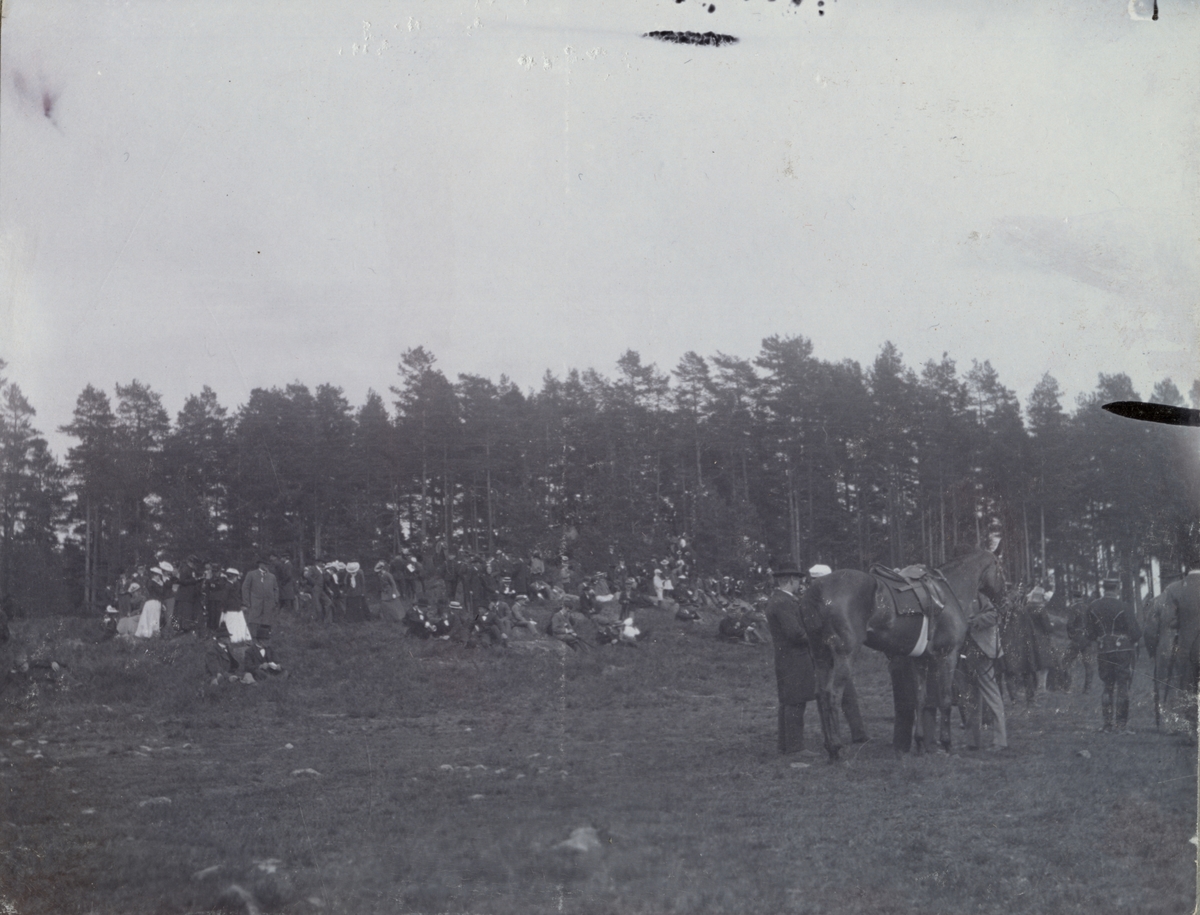 Titel: Text i fotoalbum: "Ränneslätt K 4 Kav. aspirantskola 1900". Åskådare.