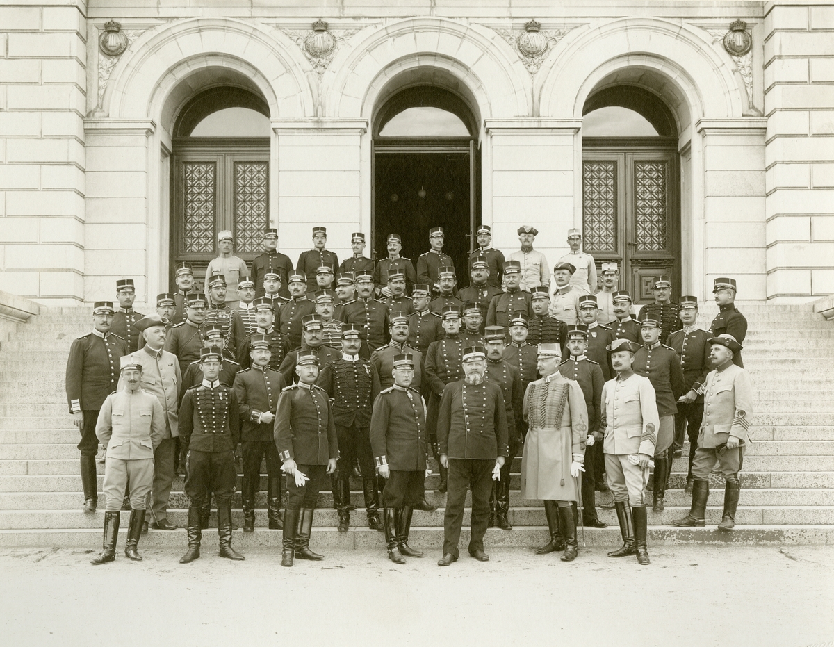 Grupporträtt av officerare vid majorskursen i Uppsala utanför universitetshusets entré 1908.