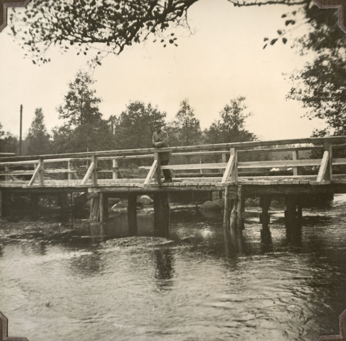 Text i fotoalbum: "Som avslutning på repetitionsövningarna 1935 fick jag med ett kompani bygga en liten landsvägsbro söder om Eksjö vid Qvarnkullen. Brobygget vid Qvarnkullen nalkas sin fullbordan. Brobyggaren själv".