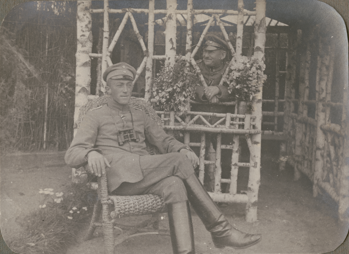 Titel: Text i fotoalbum: "Min Unterstand (bunker) vid Olai sommaren 1916. Lugna dagar på sommaren."