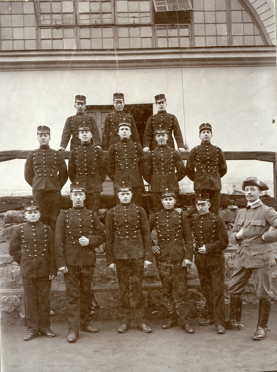 Grupporträtt av soldater vid Positionsartilleriregementet A 9, omkring 1910.