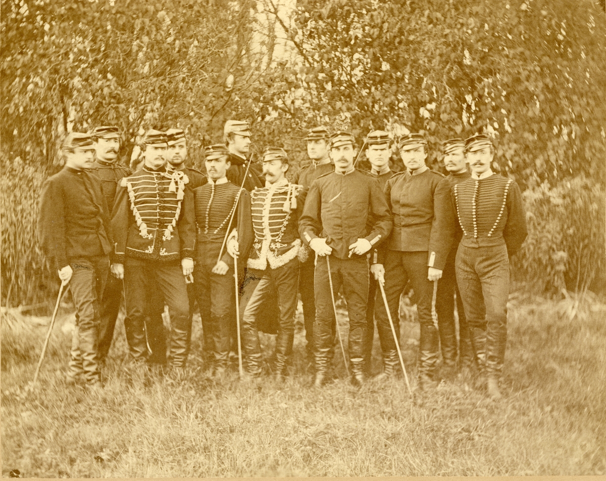 Grupporträtt av officerare och soldater vid olika regemente på Salbohed, omkring 1890.