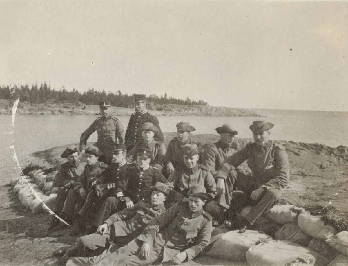 Titel: Gruppbild av soldater från Göta livgarde I 2 på stranden.