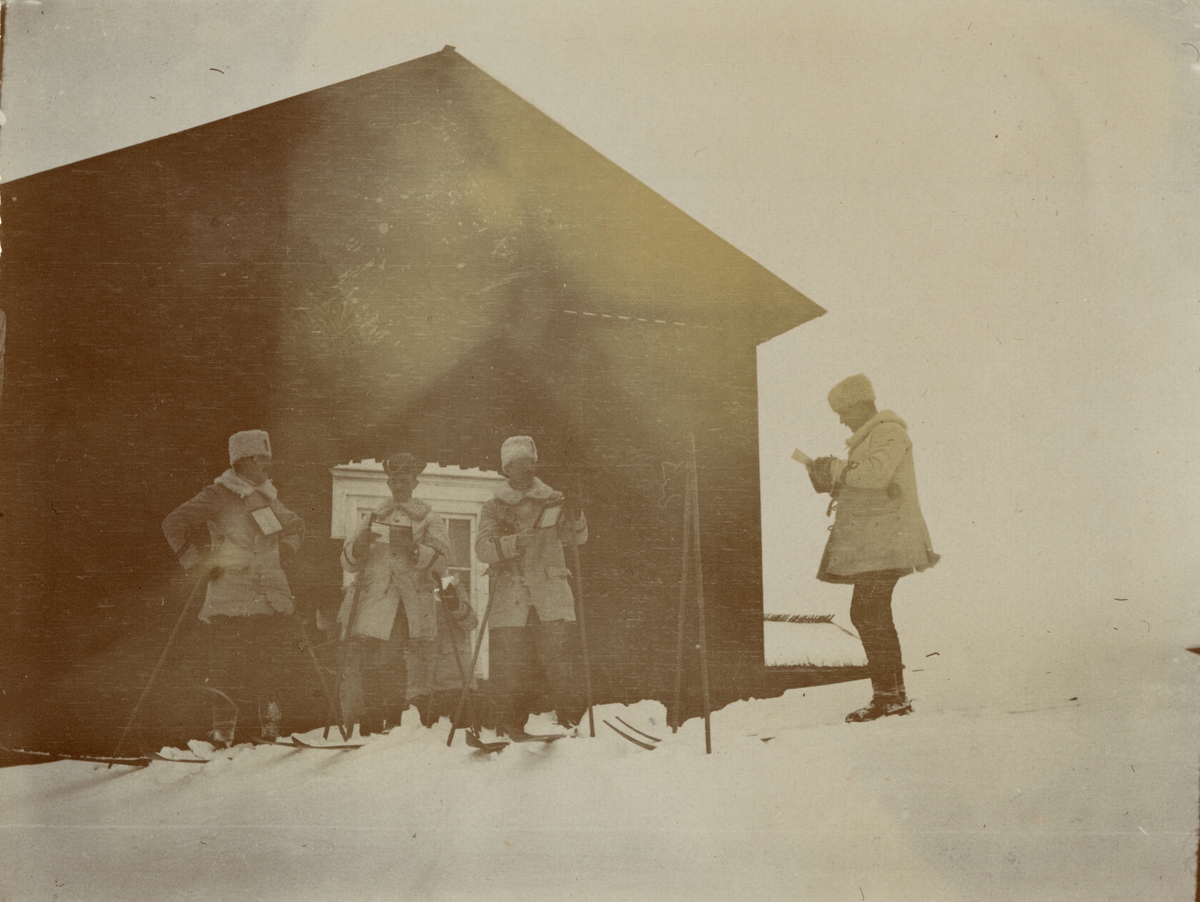 Smålands husarregemente K 4 på skidor, vinterövning i Norrbotten omkring 1910.