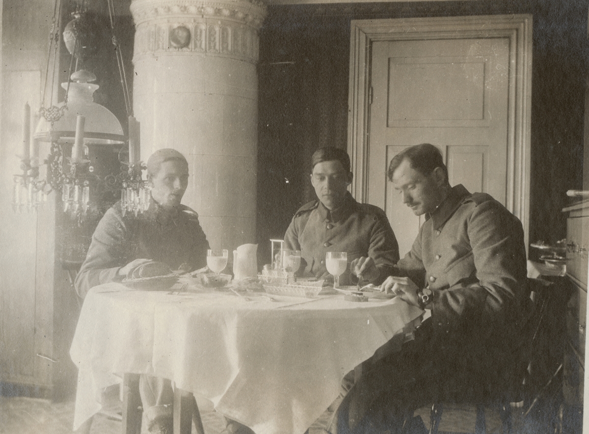 Titel: Tre soldat från Göta livgarde I 2 vid matbordet.